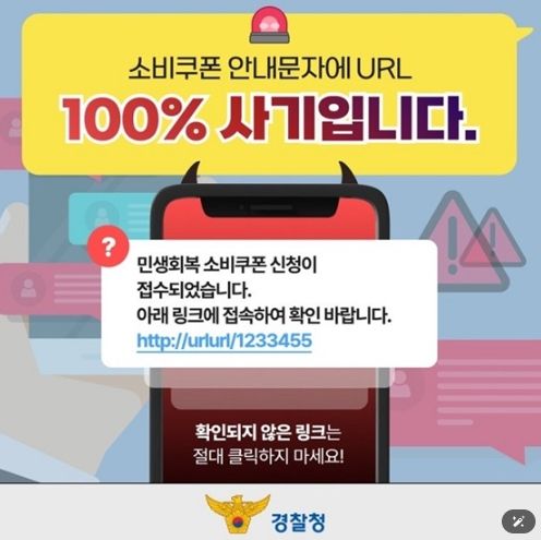 문자메시지를 악용하는 개인정보 피해(스미싱)를 예방하기 위해 민생회복 소비쿠폰과 관련하여 '인터넷 주소 바로가기(URL·링크)'가 포함된 문자 및 SNS는 일절 발송하지 않습니다!