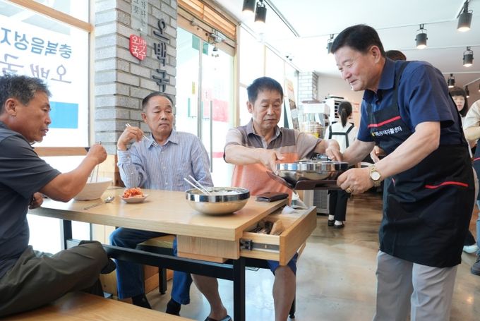서현일보 기자 | 김영호 음성군의회 의장은 지난 7월 25일 음성읍 음성천서길에 위치한 ‘오백국수 2호점’을 찾아 하루 동안 일일점장으로 나서며 자활근로사업에 참여 중인 주민들과 특별한 시간을 보냈다.