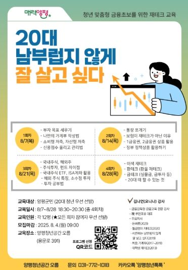 이번 특강은 청년들의 수요에 맞춘 실용형 교육으로 구성됐으며, 8월 한 달간 양평청년공간 오름(용문면 용문로 391)과 경기청년공간 내일스퀘어 양평(양평읍 양근로 196) 두 곳에서 진행될 예정이다.