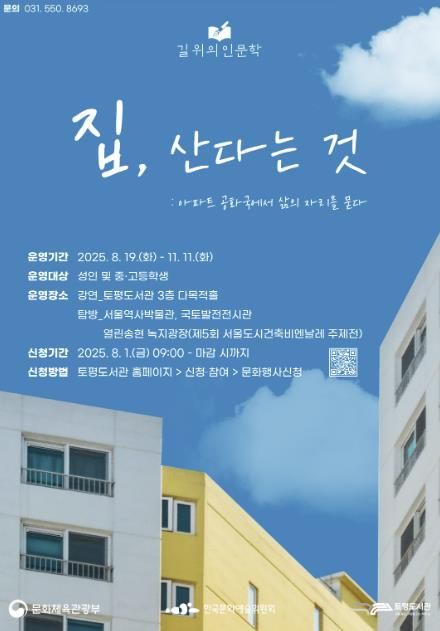 서현일보 기자 | 구리시 토평도서관이 문화체육관광부가 주최하고 한국문화예술위원회가 주관하는 ‘2025년 길 위의 인문학’ 공모 사업에 선정되어, 오는 8월부터 ‘집, 산다는 것 – 아파트 공화국에서 삶의 자리를 묻다’ 프로그램을 운영한다.
