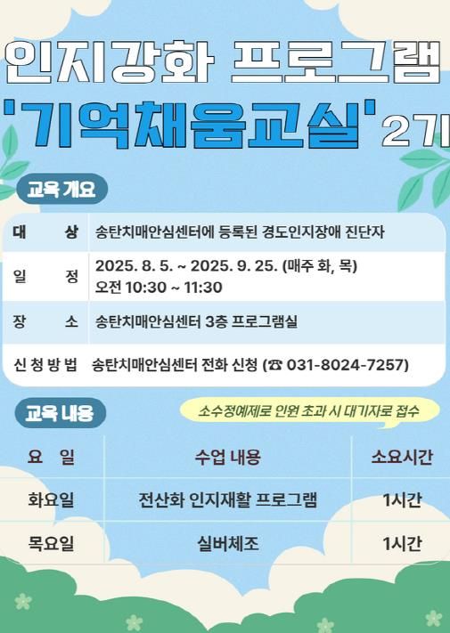 참여 대상은 치매 선별검사 결과, 인지 저하자 및 경도인지장애 진단자이며, 모집 기간은 8월 4일까지 선착순으로 접수한다.
