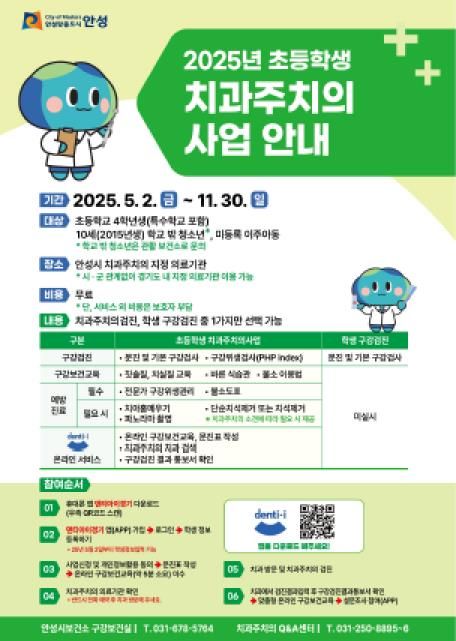 대부분의 초등학생이 학기 중에 의료기관을 방문하여 치과 검진을 받는데 어려움이 있어 여름방학 기간을 이용하여 보호자와 함께 무료치과 검진을 받을 것을 권장하고 있다.