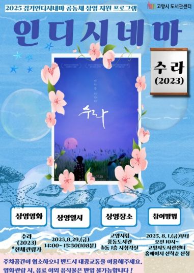 상영작은 황윤 감독의 영화‘수라’로, 8월 29일 금요일 14시부터 15시 50분까지 풍동도서관 B동 1층 시청각실에서 상영한다.