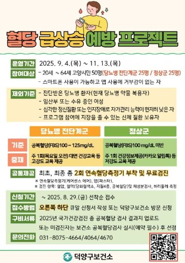 서현일보 기자 | 고양특례시 덕양구보건소는 당뇨병 전단계자의 건강한 생활습관 형성과 조기 예방관리를 위해 9월부터 운영 예정인 ‘혈당 급상승 예방 프로젝트’의 참여자를 모집한다고 밝혔다.