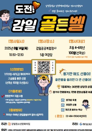 서현일보 기자 | 하남시 감일청소년문화의집이 광복절을 기념해 감일동 청소년들과 함께하는 특별한 역사 퀴즈대회‘도전! 감일 골든벨’을 개최한다. 이번 행사는 8월 14일 오전 10시 30분, 감일공공복합청사 5층 대강당에서 열린다.