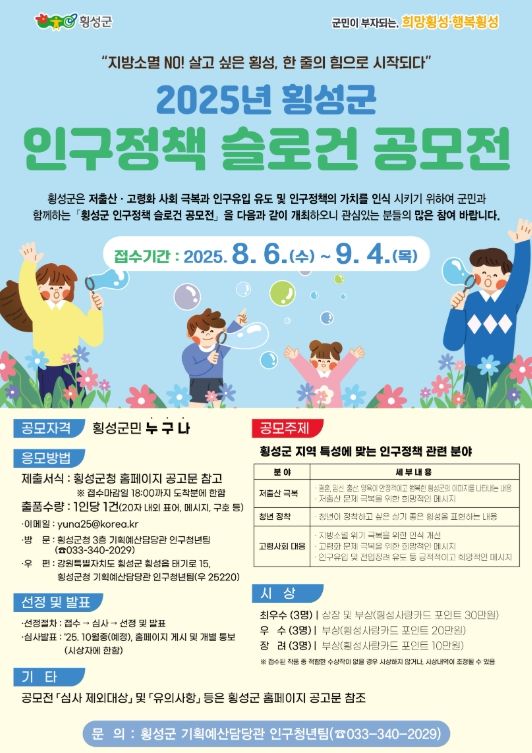 이번 공모전은 횡성군 지역 특성에 맞는 인구정책 관련분야로, △저출산 극복 △청년 정착 △고령사회 대응을 주제로 하며, 슬로건의 20자 내외의 창의적이고 기발한 문구를 통해 인구감소 대응 메시지를 전달하고, 군정 홍보에 실질적으로 활용하기 위한 취지로 마련됐다.