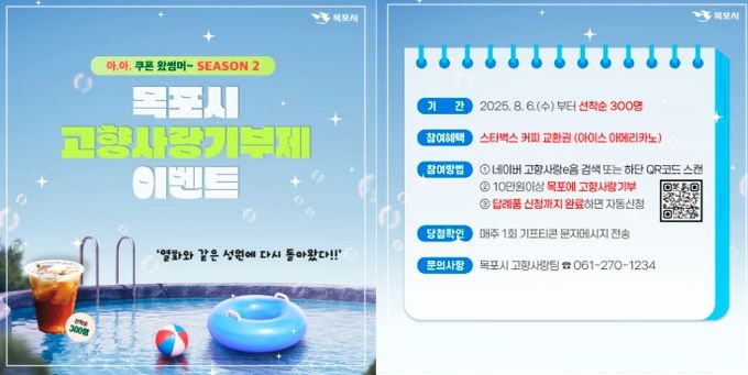서현일보 한예원 기자 | 목포시는 고향사랑기부제에 대한 기부자들의 높은 관심과 적극적인 참여에 힘입어, ‘아·아 쿠폰왔썸머~ 고향사랑기부 참여 이벤트 시즌2’를 새롭게 추진한다고 밝혔다.