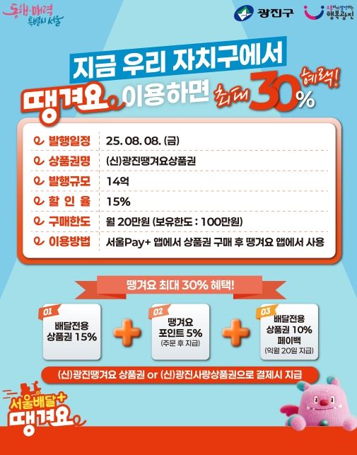 ‘광진땡겨요상품권’은 서울페이플러스 앱에서 구매할 수 있으며, 배달앱 ‘땡겨요’의 광진구 등록 가맹점에서 사용할 수 있다.
