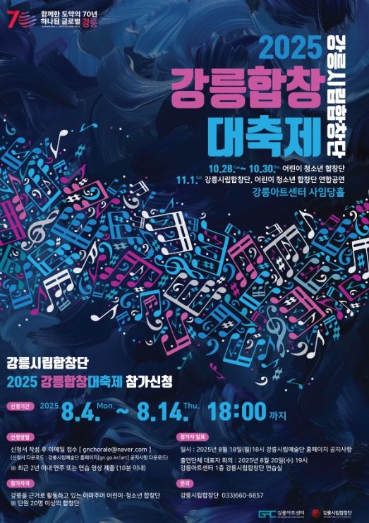 모집 대상은 강릉을 기반으로 활동하는 어린이·청소년 합창단으로, 단원 수가 20명 이상이며 축제 전 기간 참여가 가능해야 한다.