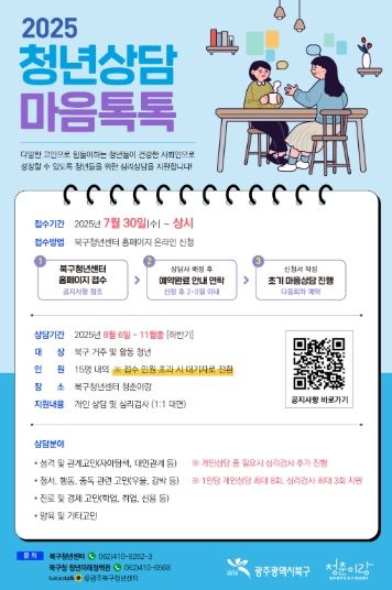 서현일보 한예원 기자 | 광주시 북구가 청년들의 마음 건강을 돌보고 심리적 안정을 도모하기 위해 2025년 하반기 ‘청년상담 마음톡톡’ 프로그램 운영에 나선다고 6일 밝혔다.