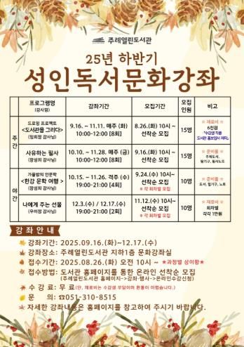 신청은 8월 26일부터 주례열린도서관 홈페이지 강좌 신청 메뉴를 통해 가능하며 선착순 모집한다.