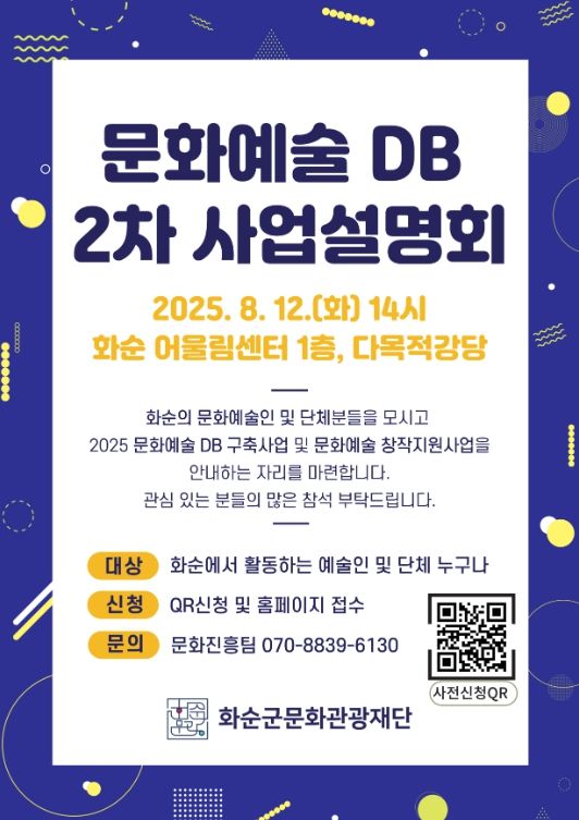 서현일보 한예원 기자 | (재)화순군문화관광재단은 8월 12일 오후 2시 화순 어울림센터 다목적강당에서 ‘2025 문화예술인 DB 구축 2차 사업설명회’를 개최한다고 밝혔다.