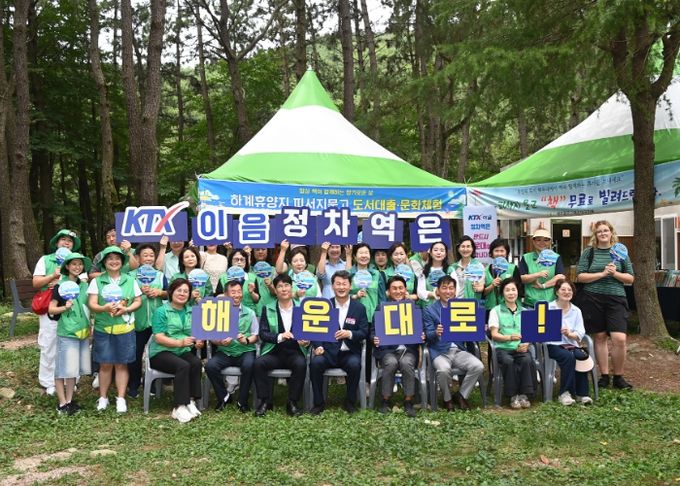 회원들은 무더위를 피해 장산계곡을 찾은 주민에게 KTX-이음 유치 필요성을 알리고 서명운동 참여를 독려했다.