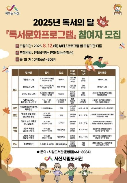 서현일보 한예원 기자 | 충남 서산시는 독서의 달 9월을 맞아 시립도서관에서 다채로운 독서 문화 프로그램을 운영한다고 7일 밝혔다.