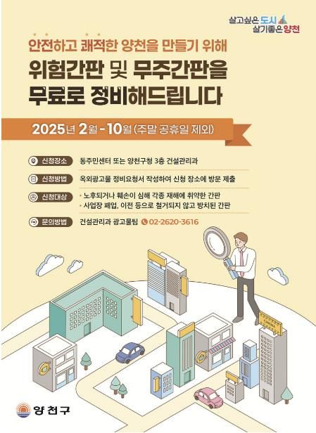 아울러, 양천구는 노후하거나 훼손이 심한 ‘위험간판’과 주인 없는 ‘무주간판’에 대해 무료 정비사업을 연중 실시하고 있다.