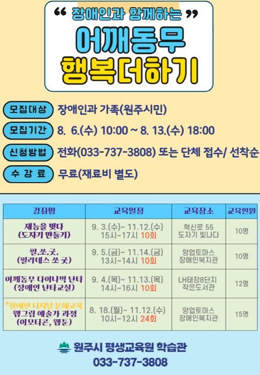 서현일보 한예원 기자 | 원주시 평생교육원 학습관은 8월 13일까지 장애인과 함께하는 ‘어깨동무 행복 더하기’ 과정 수강생을 모집한다.