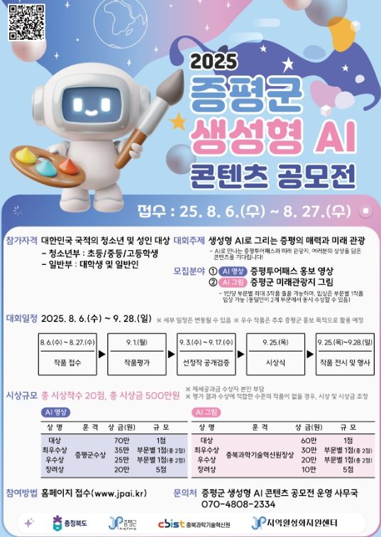 군 관계자는 “이번 공모전은 증평의 문화관광 자원과 생성형 AI라는 첨단기술을 접목한 미래형 콘텐츠 실험”이라며 “AI를 매개로 한 창의적인 상상력이 지역 관광의 새로운 가능성을 열 수 있기를 기대한다”고 밝혔다.