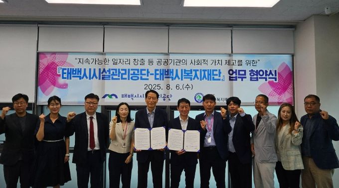 서현일보 한예원 기자 | 태백시시설관리공단과 태백시복지재단은 8월 6일, 공단 이사장실에서 ‘지속가능한 일자리 창출 등 공공기관의 사회적 가치 제고를 위한 업무협약’을 체결했다.
