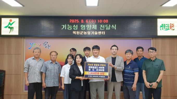 서현일보 한예원 기자 | 지난 6일 옥천군 소재 충북농자재(대표 김두열)와 대전시 소재 ㈜엠테코트(대표 이혁주)가 관내 농업인을 위해 600만 원 상당의 칼마붕골드 400병(500㎖)과 1,200만 원 상당의 엠도리 800병(500㎖)을 옥천군포도연합회(회장 이정민)에 전달했다.