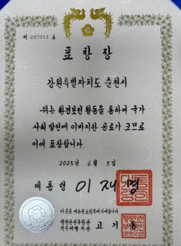 서현일보 한예원 기자 | 춘천시가 ‘2025년 환경보전 유공’ 대통령 표창을 받았다.