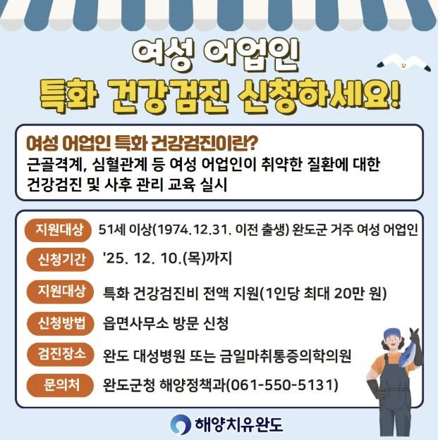 서현일보 한예원 기자 | 완도군은 51세 이상 여성 어업인을 대상으로 특화 건강검진비 전액 지원 사업을 추진한다.