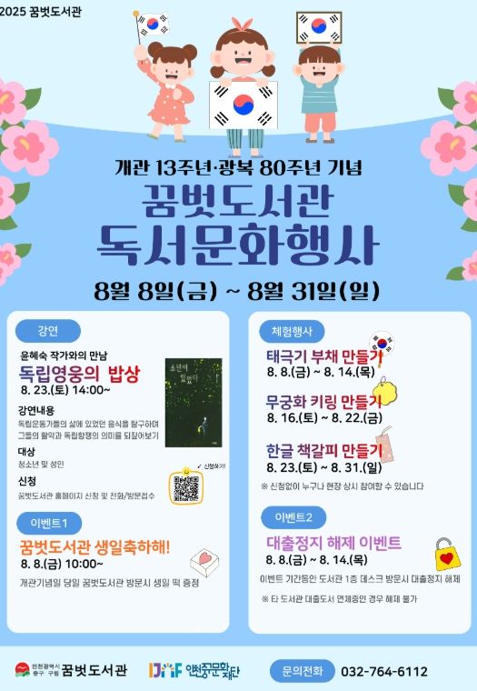 (재)인천중구문화재단은 오는 8일부터 31일까지 개항장 일원 ‘구립 꿈벗도서관(홍예문로 32 소재)’에서 ‘광복 80주년 기념 독서 문화 행사’를 진행한다고 밝혔다.