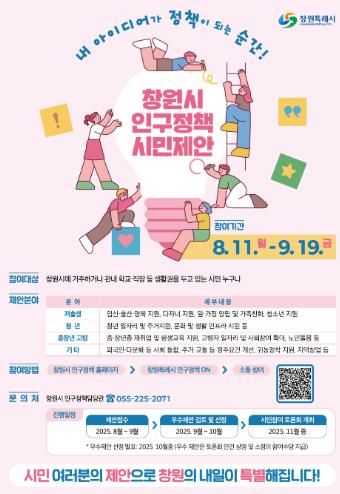 김만기 인구정책담당관은 “시민 여러분의 참신한 아이디어가 창원시 인구정책의 방향을 설정하는 소중한 출발점이 될 것”이라며 “많은 관심과 적극적인 참여를 부탁드린다”고 전했다.