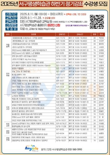 서현일보 한예원 기자 | 인천 서구는 2025년 하반기 서구평생학습관 정기프로그램의 학습자를 11일부터 모집한다고 7일 밝혔다.