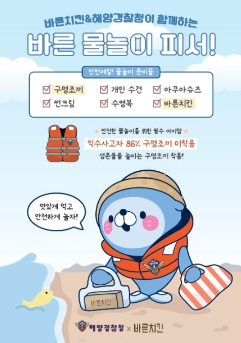 서현일보 기자 | 해양경찰청은 바른치킨과 함께 여름철을 맞아 구명조끼 착용 생활화를 통한 안전한 물놀이를 위한 협업하여 홍보한다고 10일 밝혔다.