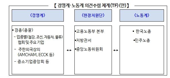 경영계는 경영자총협회(경총)가 중심이 되어 주한외국상의, 중소기업중앙회, 주요 업종별 협회 및 기업 등의 의견을, 노동계는 한국노총과 민주노총이 주요 의견을 수렴하는 체계로 구상하고 있다. 아울러 상시 소통창구를 운영하여 경영계, 노동계에서 의견을 제출하면, 즉각적으로 정보를 제공하거나 차후 법리 해석을 통해 신속하게 답을 받을 수 있도록 운영할 예정이다. 한편, 노사가 원하고 필요한 경우 노사정이 함께 소통할 수 있는 체계도 검토해 나갈 예정이다.