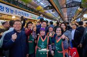서현일보 라태규 기자 | 이재명 대통령은 30일 오후 제주 타운홀미팅 '제주의 마음을 듣다' 종료 후, 김혜경 여사와 함께 1박 2일 제주 일정의 마지막 일정으로 동문시장을 방문했다. 동문시장은 제주시 도심에 위치한 대표적인 전통시장으로, 대통령 부부의 방문 소식에 상인들과 방문객들은 놀라움 속에 환호와 박수로 이들을 맞이했다. 입구에 서 있던 한 외국인 관광객은 어디서 왔냐는 이 대통령의 질문에 “오스트레일리아”고 답하기도 했다. 이 대통령 부부는 셀카촬영과 악수를 이어가며 과일모찌 가게에 들러 온누리상품권으로 한라봉모찌와 딸기모찌를 구입해 즉석에서 강유정 대변인, 하정우 수석 등과 함께 시식했다. 이동 내내 이어지는 셀카요청에도 이 대통령 부부는 반갑게 응했다. 그러자 시장을 찾은 많은 도민들은 이동 중인 이 대통령 부부를 향해 "사랑해요", "와 대박", "화이팅"을 외치는 소리로 화답했다. 이 대통령은 특히 어린이들의 사진 요청에 적극적으로 답했다. "애기 있어요"라는 소리가 들리면 발걸음을 멈추고 아이들과 하이파이브를 하거나 반갑게 셀카를 찍었다. 또한 강아지를 안