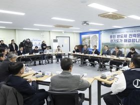 서현일보 라태규 기자 | 용인 반도체클러스터 전력난 해법을 제시한 김동연 경기도지사가 23일 현장을 찾아 “경기도가 용인 반도체클러스터의 든든한 지원군이 되겠다”고 밝혔다. 김동연 지사는 29번째 민생경제 현장투어(달달버스)차 이날 오전 용인시 처인구 원삼면 일원에 조성 중인 용인 반도체클러스터 일반산업단지 현장사무소를 찾아 SK하이닉스 관계자, 협력사 대표들과 기업인 간담회를 진행하고 산업단지 조성 현장을 점검했다. 간담회에는 이상식 국회의원, 황준기 용인특례시 제2부시장, 박호현 SK하이닉스 용인CPR 부사장, 장효식 SK에코플랜트 부사장 및 협력사 대표 등이 함께했다. 간담회에서는 김동연 지사가 하루 전 발표한 용인 반도체클러스터 전력 문제 해법이 주로 언급됐다. 김 지사는 지난 22일 한전과 ‘도로-전력망 공동건설 협력체계 구축 업무협약’을 체결해 새로 건설하는 지방도 318호선 용인·이천 27.02㎞ 구간 땅 밑으로 전력망을 구축하기로 한 바 있다. 김 지사는 “(용인 반도체클러스터) 전력 문제 해결을 위해서 경기도가 그동안 많은 노력을 해왔는데 어제 그 결실을 맺어 새롭고 획기적인 방법으