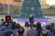 서현일보 한예원 기자 | 용인특례시는 22일 오후 기흥구 영덕동 산 1-1번지에서 ‘크리스마스트리 점등식’ 행사가 열렸다고 23일 밝혔다. 기흥구기독교연합회가 주관한 이 행사에는 이상일 시장을 비롯해 용인지역 교회 관계자 약 40여명이 참석했다. 이날 점등한 크리스마스트리는 내년 1월까지 희망과 사랑의 빛을 밝혀준다. 이 행사에서 기흥구기독교연합회는 어려운 이웃을 위해 사용해달라며 기흥구에 라면 200박스를 기탁했다. 이상일 시장은 축사를 통해 “오늘 우리가 밝히는 성탄트리가 이곳을 지나는 분들에게 세상의 빛으로 오신 아기 예수님 탄생의 의미를 잘 전달하기를 소망한다”며 “시민들이 성탄절을 맞아 좀 더 넉넉한 마음으로 서로를 더 많이 배려하고 어두운 곳에 사랑을 많이 전달하면 좋겠다”고 말했다.