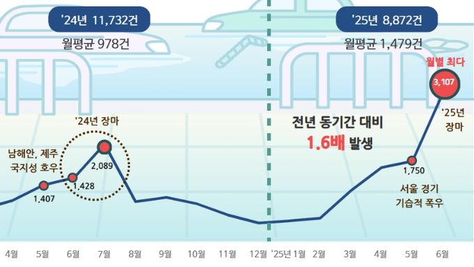 배수시설 민원은 집중호우가 잦은 5월에서 7월 사이에 주로 발생하는 경향을 보이며, 2024년 민원의 40.9%가 이 시기에 발생했다. 또한 2024년 월평균 978건이던 민원은 올해 1,479건으로 크게 늘었고, 특히 2025년 6월에는 분석 기간 중 가장 많은 민원이 접수되는 등 2025년 상반기 배수시설 관련 민원은 전년도 상반기 대비 약 1.6배 증가했다.