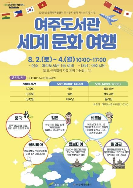 서현일보 기자 | 여주시 평생교육과 여주도서관에서는 문화체육관광부 ‘도서관 다문화서비스 지원사업’의 일환으로 오는 8월 2일부터 4일까지 총 3일간, 오전 10시에서 오후 5시까지 ‘세계 문화 여행’프로그램을 운영한다.