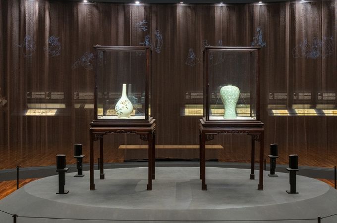 전시장 중앙에는 고려청자와 조선백자를 대표하는 국보 '청자상감운학문매병', '백자청화철채동채초충난국문병'이 오백 년의 시간을 넘어 나란히 마주하고 있다.