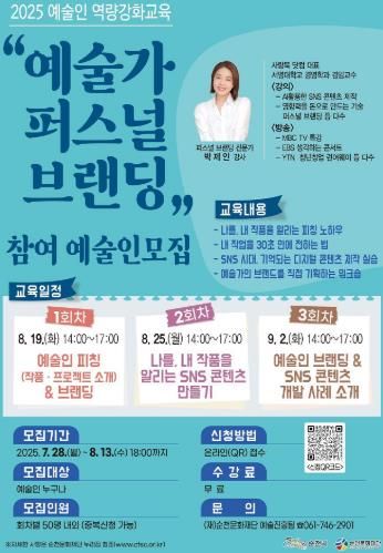 서현일보 한예원 기자 | 순천문화재단은 지역 예술인 역량강화교육의 일환으로 진행되는 ‘예술가 퍼스널 브랜딩’ 교육 참여예술인을 오는 13일까지 모집한다고 밝혔다.