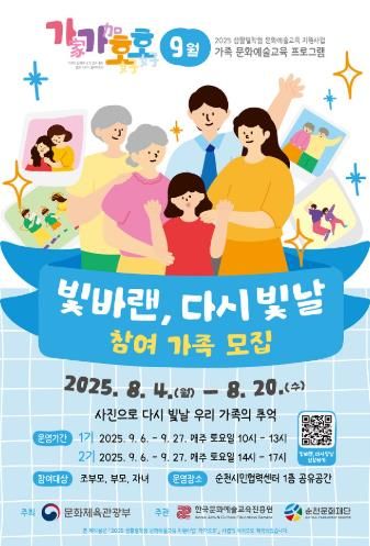 서현일보 한예원 기자 | (재)순천문화재단은 오는 20일까지 2025 생활밀착형 문화예술교육지원사업의 일환으로 '가가호호(家加好好)'의 네 번째 프로그램인 ‘빛바랜, 다시 빛날’ 프로그램 참여 가족을 모집한다고 밝혔다.