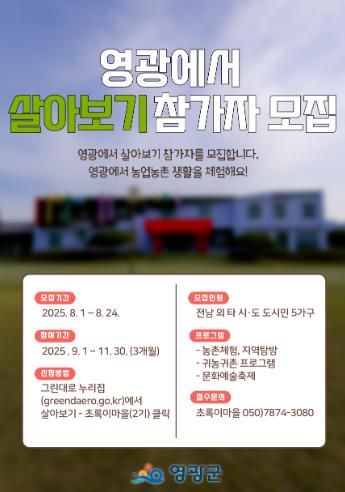 서현일보 한예원 기자 | 영광군은 귀농·귀촌을 희망하는 도시민의 안정적인 농촌 정착을 지원하기 위해 '2025년 영광에서 살아보기' 2기 참가자를 모집한다.