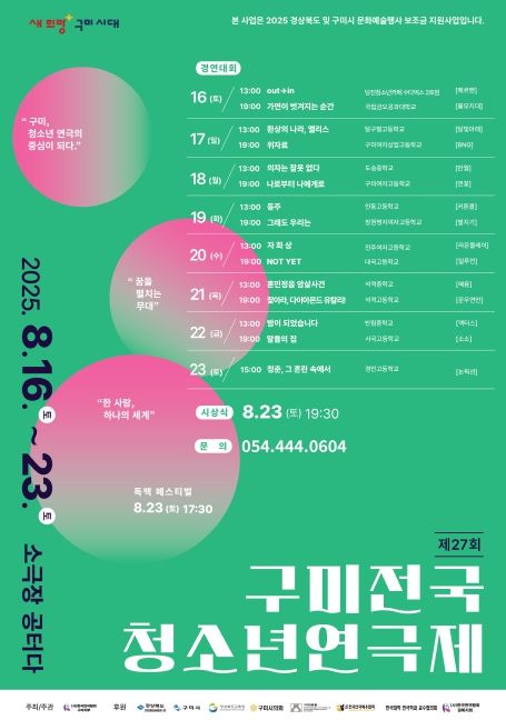 연극제 일정은 16일 당진청소년카페 메르헨의 'out→in'과 금오공대의 '가면이 벗겨지는 순간'을 시작으로 17일에는 달구벌고의 '환상의 나라, 엘리스'와 구미여상의 '위자료', 18일에는 도송중의 '의자는 잘못 없다'와 구미여고의 '나로부터 나에게로', 19일에는 인동고의 '동주'와 창원 명지여고의 '그래도 우리는', 20일에는 진주여고의 '자화상'과 대곡고의 'NOT YET', 21일에는 석적중의 '훈민정음 암살사건'과 석적고의 '찾아라, 다이아몬드 유칼리!', 22일에는 창원 반림중의 '밤이 됐습니다'와 사곡고의 '말들의 집', 23일에는 의정부 경민고의 '청춘, 그 혼란 속에서', 독백페스티벌(17:30), 시상식(19:30) 순으로 진행한다.