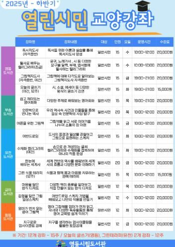 익산시는 '2025년 하반기 열린시민교양강좌'를 운영하며, 도서관 7곳에서 다양한 평생교육 프로그램을 제공한다고 7일 밝혔다.