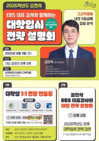서현일보 한예원 기자 | 순천시는 새롭게 개편되는 입시제도에 대응하고 지역 학생들의 진로·진학 준비를 지원하기 위해 오는 9일 순천시문화건강센터 다목적홀에서 ‘2026학년도 대학 입시설명회’를 개최한다고 밝혔다.