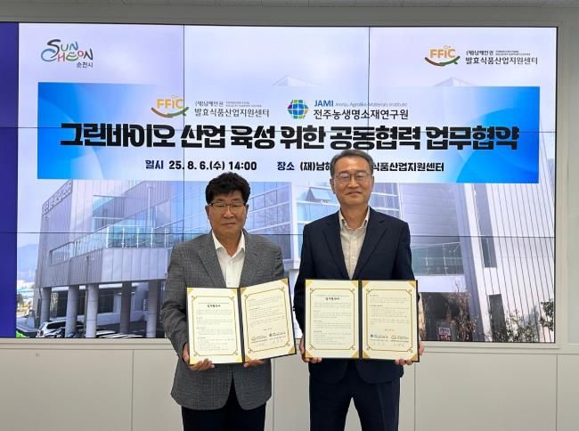 서현일보 한예원 기자 | (재)남해안권발효식품산업지원센터는 지난 6일 센터 회의실에서 순천시가 중점적으로 키우고 있는 그린바이오 산업과 발효식품 산업의 활성화를 위해 (재)전주농생명소재연구원과 업무협약을 체결했다고 밝혔다.