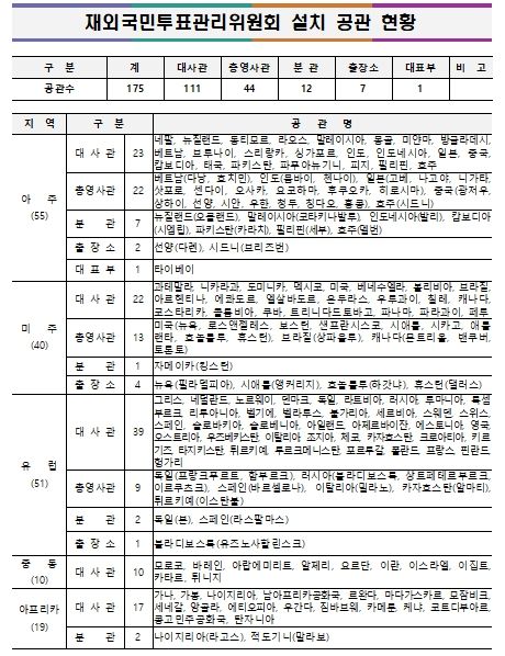 전쟁․폭동 등으로 인해 주재국 정세가 불안한 ▲주아프가니스탄이슬람공화국대사관 ▲주우크라이나대사관 ▲주레바논공화국대사관 ▲주리비아대사관 ▲주사우디아라비아왕국대사관 ▲주젯다총영사관 ▲주두바이총영사관 ▲주예멘공화국대사관 ▲주오만왕국대사관 ▲주이라크공화국대사관 ▲주이라크공화국아르빌분관 ▲주쿠웨이트국대사관 ▲주수단공화국대사관 등 13개 공관에는 재외국민투표관리위원회를 설치하지 않는다.