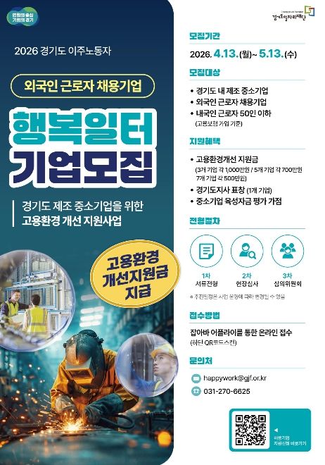 서현일보 라태규 기자 | 경기도와 경기도일자리재단은 도내 외국인 근로자를 고용한 중소 제조기업을 대상으로 ‘2026년 경기도 이주노동자 행복일터 선정사업’ 참여기업을 모집한다고 20일 밝혔다.
