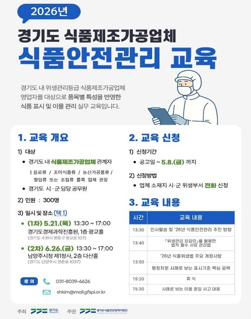 교육 신청은 4월 20일부터 5월 8일까지 업체 소재지 시군 위생부서에 전화로 신청하면 된다.